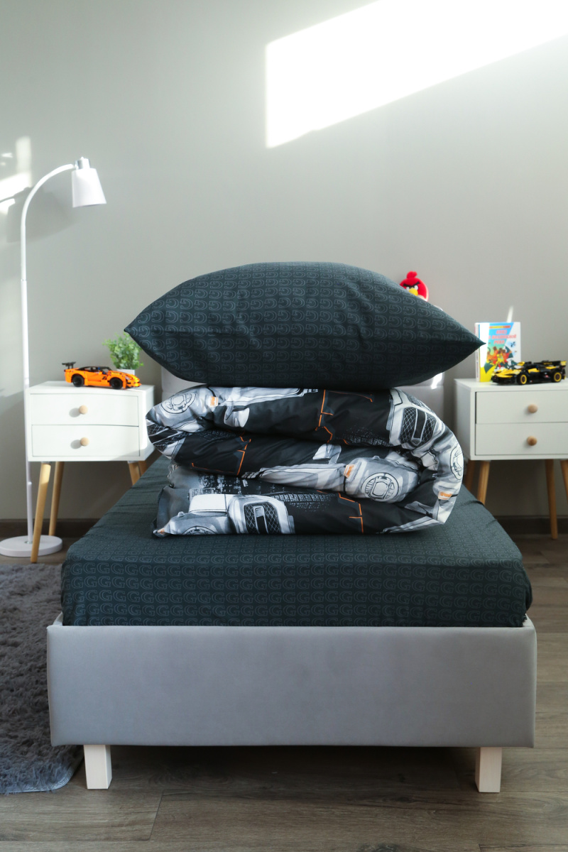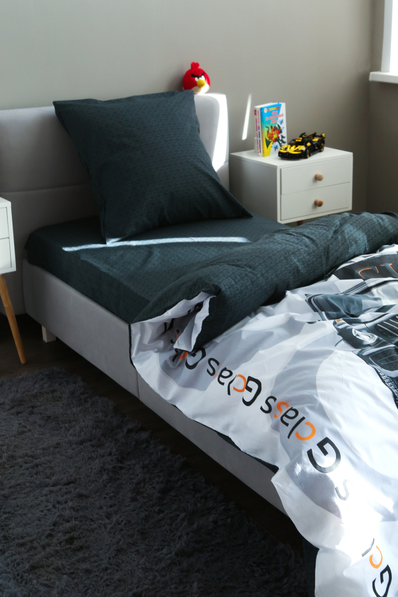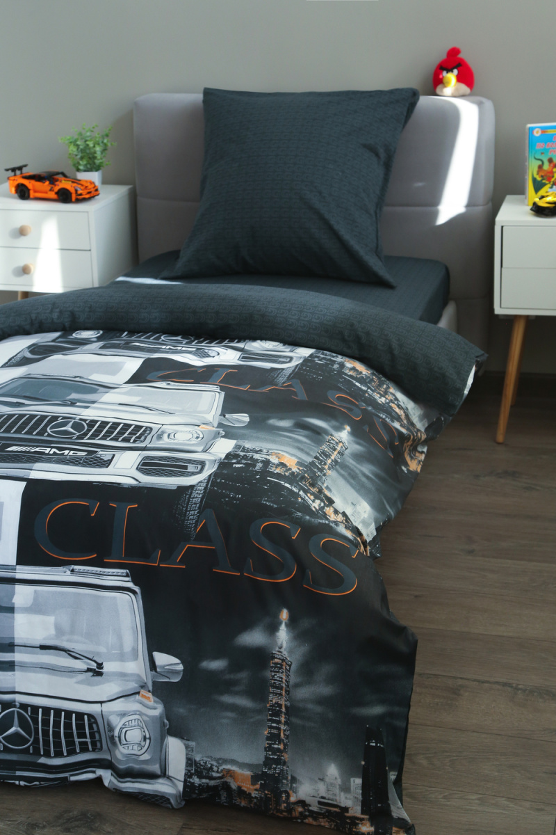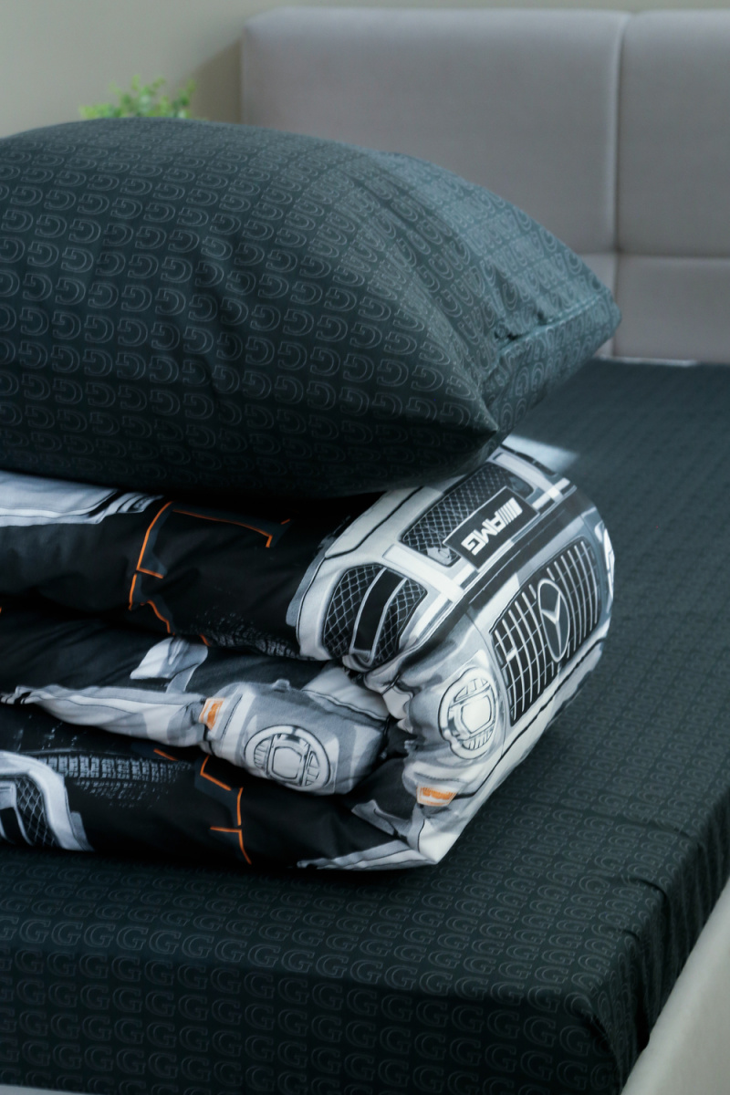 Детское постельное белье 1,5 спальное черное с рисунком автомобиля гелентваген мерседес в сером фоне из ткани поплин на 1.5 спальную кровать. Стильный дизайн гелентваген машинка понравится мальчишкам и подарит яркие мечты и сны. Постельное белье из натуральной ткани плотности 115 гр/м2, состоящий из 100% хлопка, абсолютно экологичен, не вызывает аллергии, хорошо пропускает воздух, позволяя телу дышать. При правильном уходе постельное белье 1.5 спальное с машиной прослужит вам долгое время. Предварительная стирка обязательна. Перед стиркой вывернуть изделие на изнаночную сторону. Стирать отдельно от синтетических изделий. Машинная стирка при максимальной температуре 40С, мягкий режим. Постельное белье детское 1,5 спальное с машинками стирать моющими средствами для цветных тканей. Не отбеливать. Гладить с изнаночной стороны при максимальной температуре утюга. Усадка после стирки до 3%, от заявленных размеров изделия. Ткань не подвержена образованию катышков.