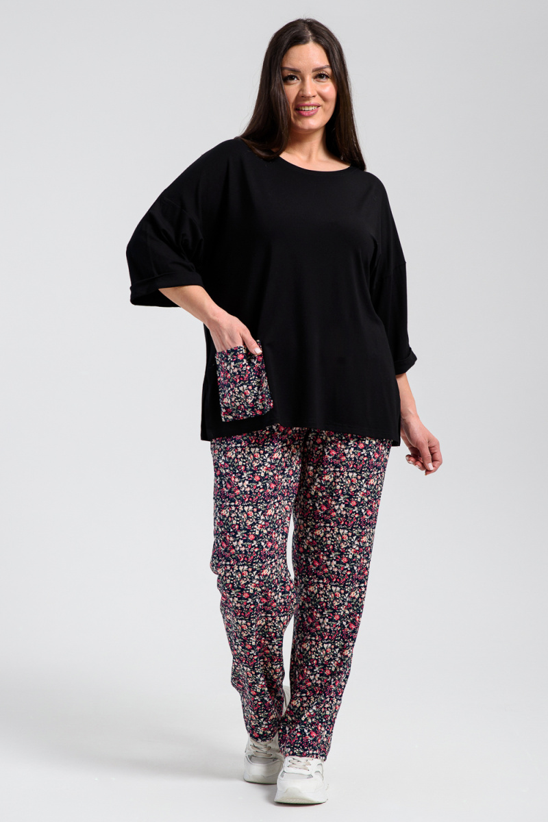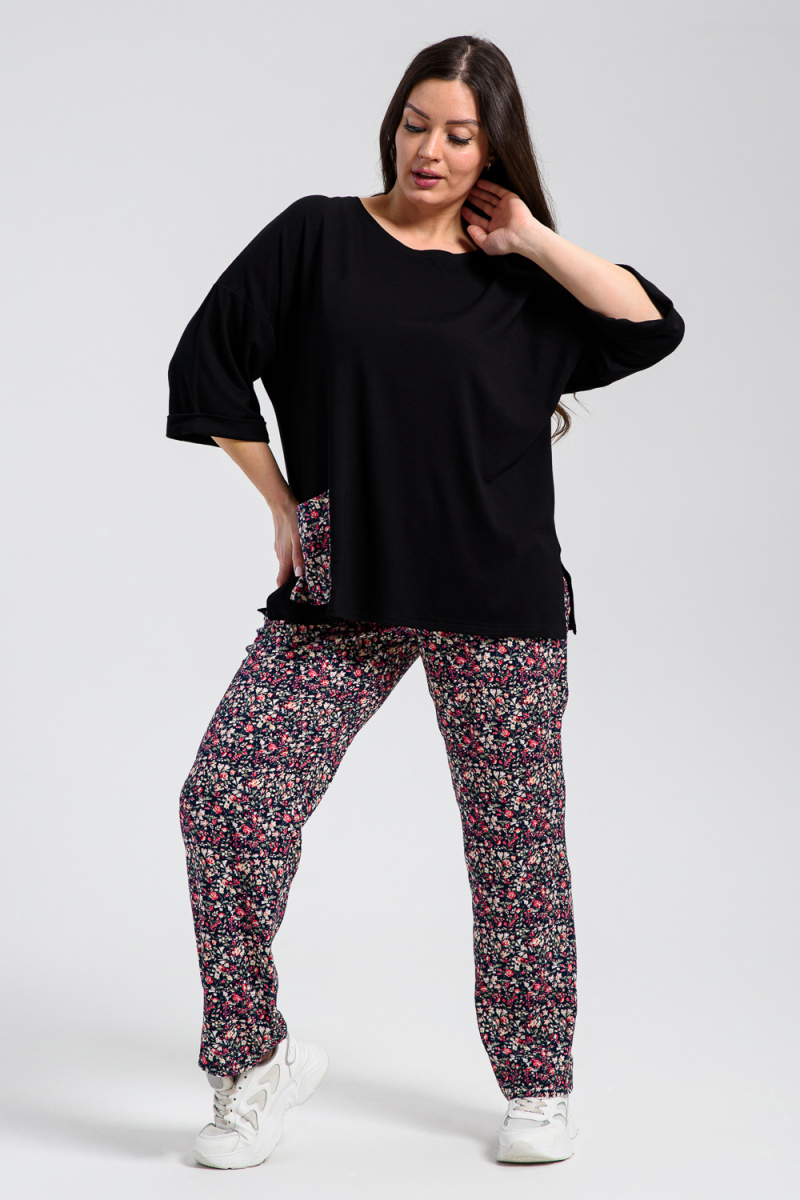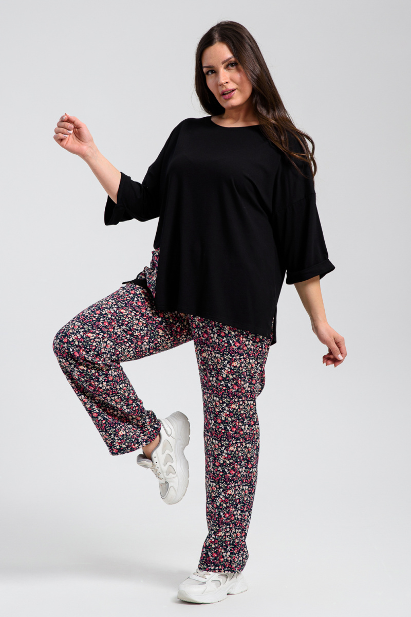 Костюм женский: туника из вискозы и брюки из штапеля. Туника очень свободная. Горловина округлая, рукав цельнокроенный со шво