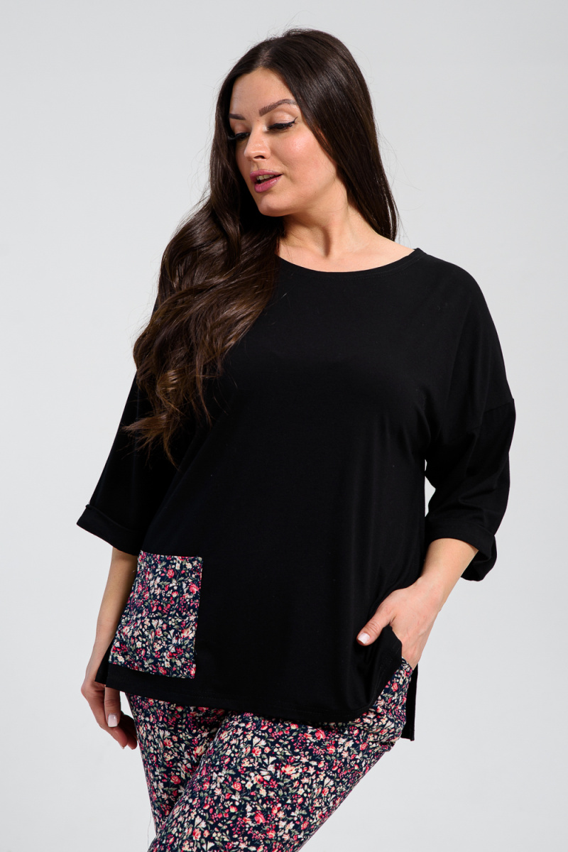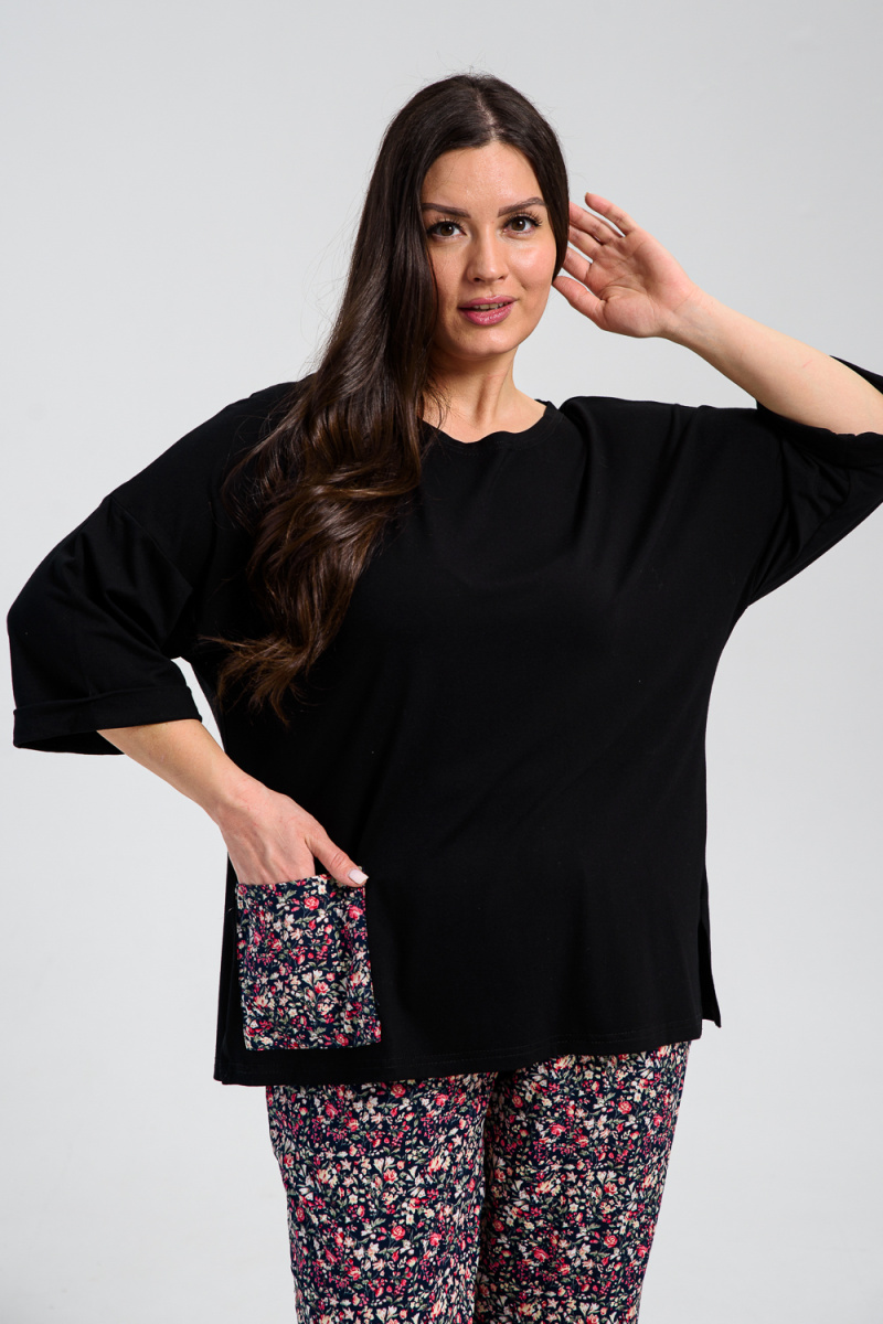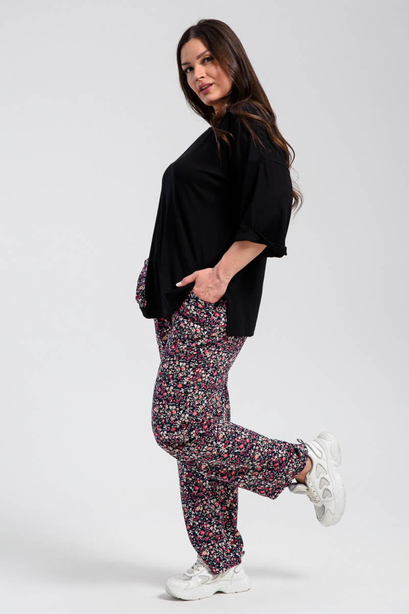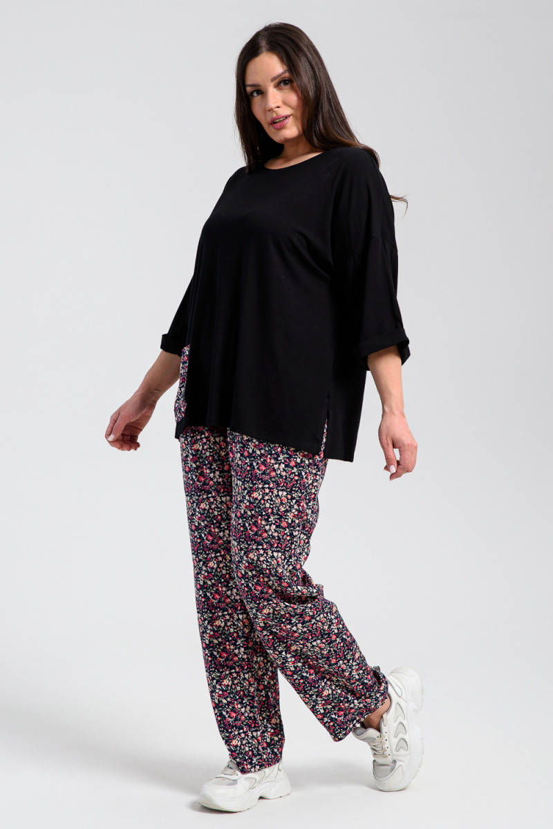Костюм женский: туника из вискозы и брюки из штапеля. Туника очень свободная. Горловина округлая, рукав цельнокроенный со шво