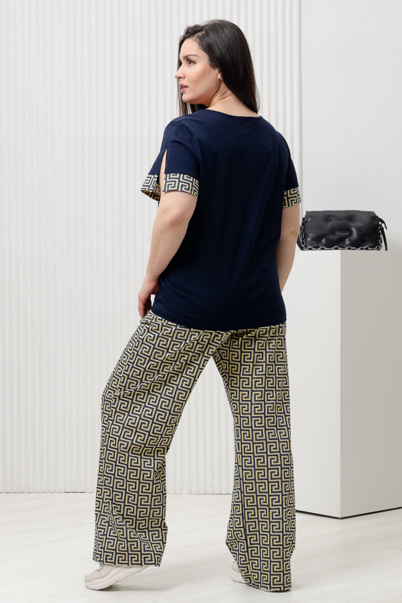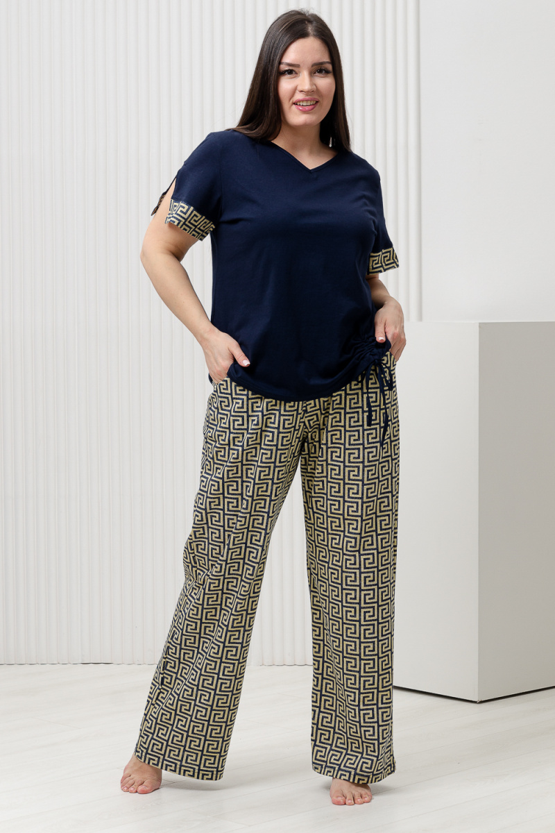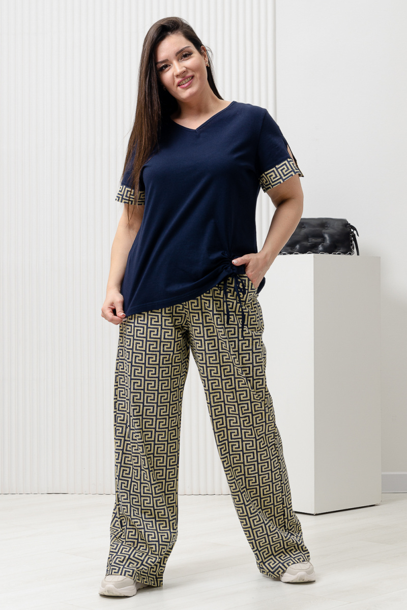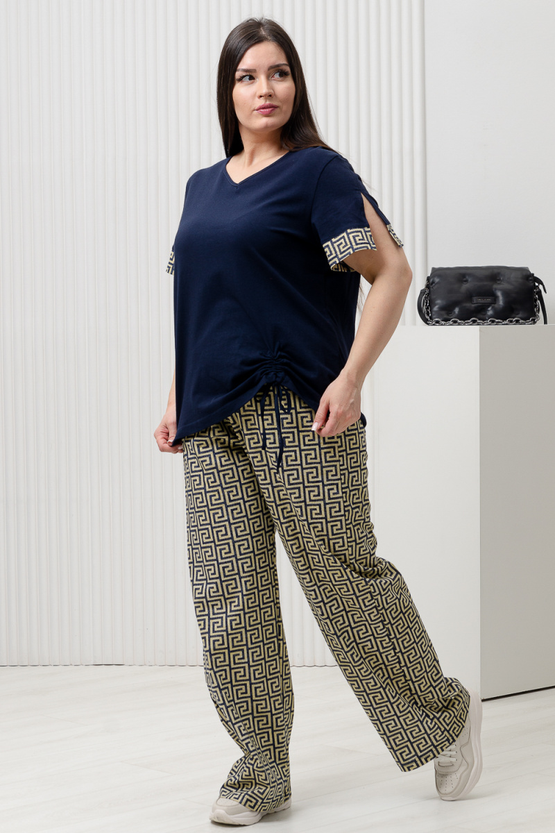 Костюм состоит из туники и брюк. Туника прямого силуэта, с V-образной горловиной. Рукав втачной, короткий, с разрезами и манжетом из отделочного полотна. В нижней части полочки обработана кулиса со шнуром. Горловина обработана бейкой из основного полотна. Брюки прямые, свободные, на поясе, с боковыми карманами.