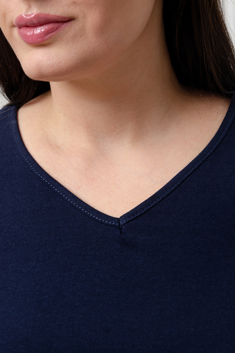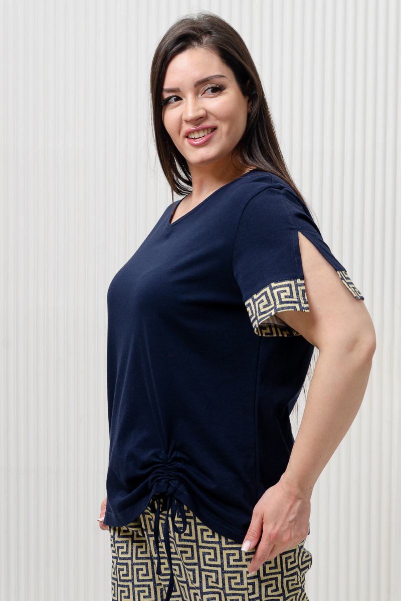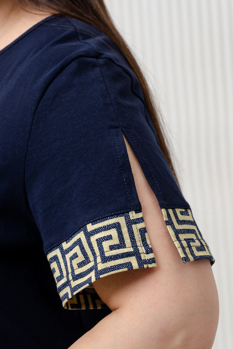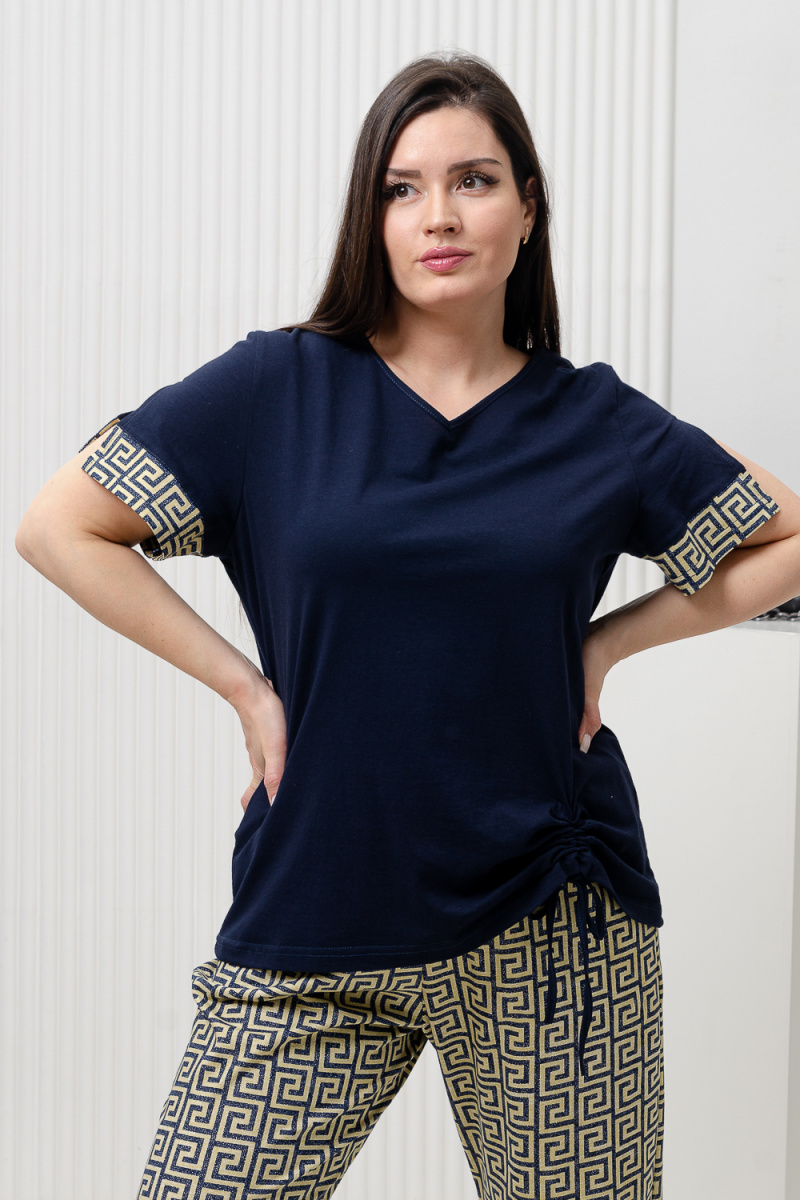 Костюм состоит из туники и брюк. Туника прямого силуэта, с V-образной горловиной. Рукав втачной, короткий, с разрезами и манжетом из отделочного полотна. В нижней части полочки обработана кулиса со шнуром. Горловина обработана бейкой из основного полотна. Брюки прямые, свободные, на поясе, с боковыми карманами.